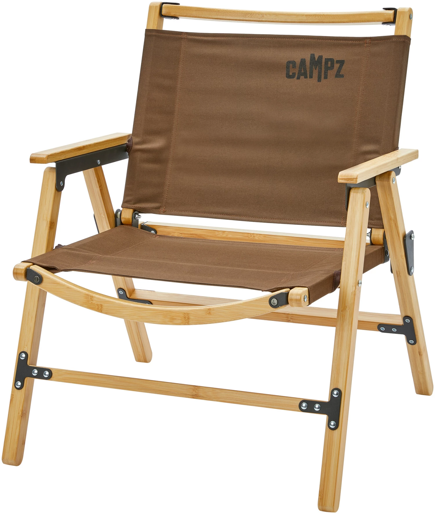 Camping chair made of bamboo wood and with polyester cover including armrests.