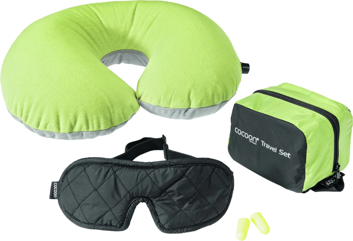 De superlichte Cocoon TravelSet bevat een 100% Coolmax reisdeken, een slaapbril, oordopjes, een ultralichte opblaasbare hoofdsteun, een microvezel reishanddoek en een kleine reistas met rits, die ook ruimte biedt voor andere reisaccessoires.
