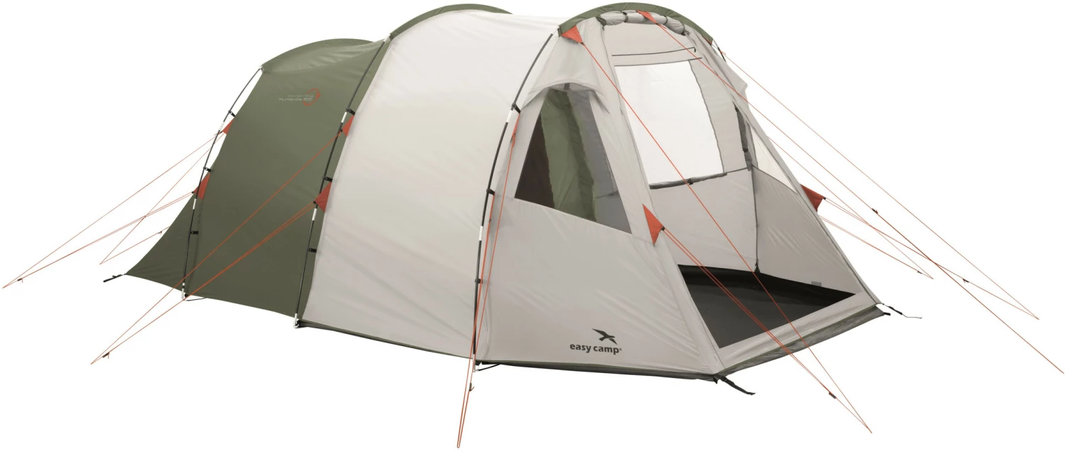 Slaapruimte voorzien voor vijf personen in een binnentent met een hangende verdeler, stevige voorgevormde glasvezel palen bieden een volledige stahoogte in het woongedeelte van de Easy Camp Huntsville 500 tunneltent met drie ramen, zijdeur, voorventilatie met kap en afgedekte achterventilatie. Het opzetbare grondzeil van de woonruimte kan gemakkelijk worden losgemaakt om te worden schoongemaakt.